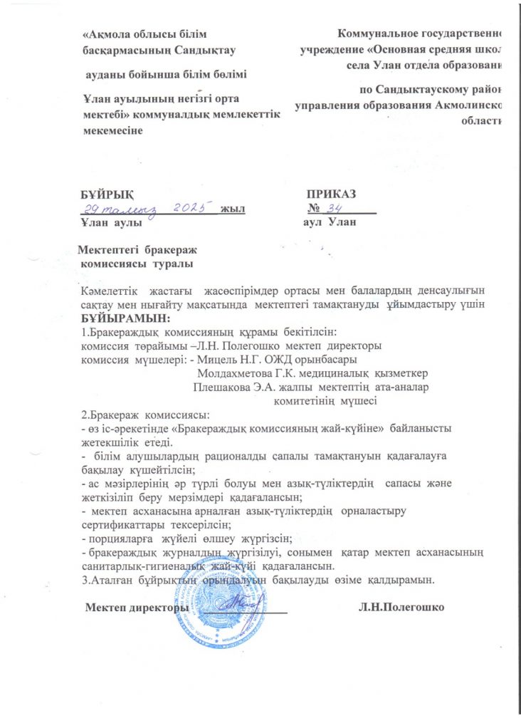 Мектептегі бракераж комиссиясы туралы бұйрық.