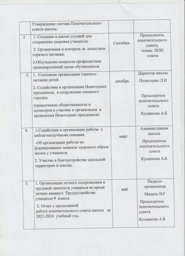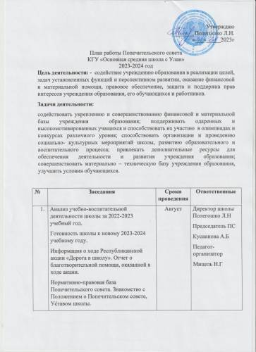 План работы попечительского совета КГУ "Основная средняя школа с.Улан" на 2023-2024 учебный год.