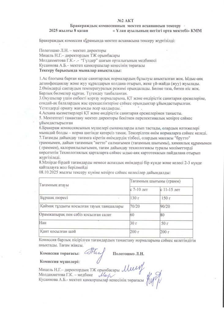 АКТ №2 бракераж комиссиясының мектеп асханасын тексеру туралы 2025 жылғы 8 қазан "Ұлан ауылының негізгі орта мектебі” КММ.