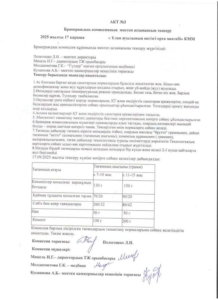 АКТ №3 бракераж комиссиясының мектеп асханасын тексеру туралы 2025 жылғы 17 қараша "Ұлан ауылының негізгі орта мектебі” КММ.