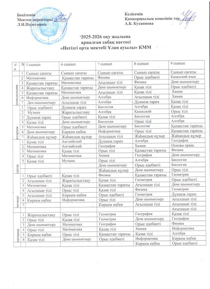 2025-2026 оқу жылына арналған 5-9 сынып кестесі.