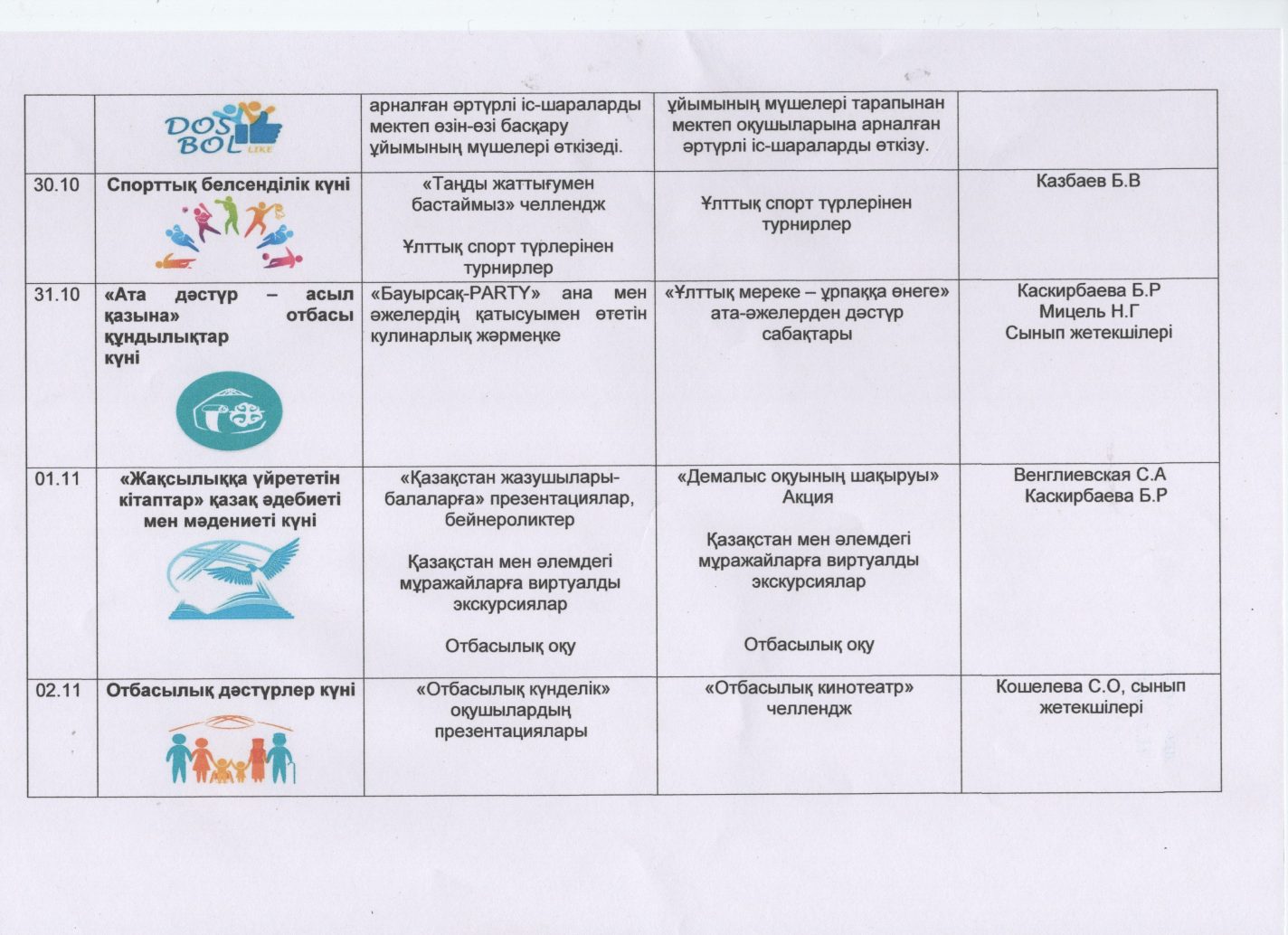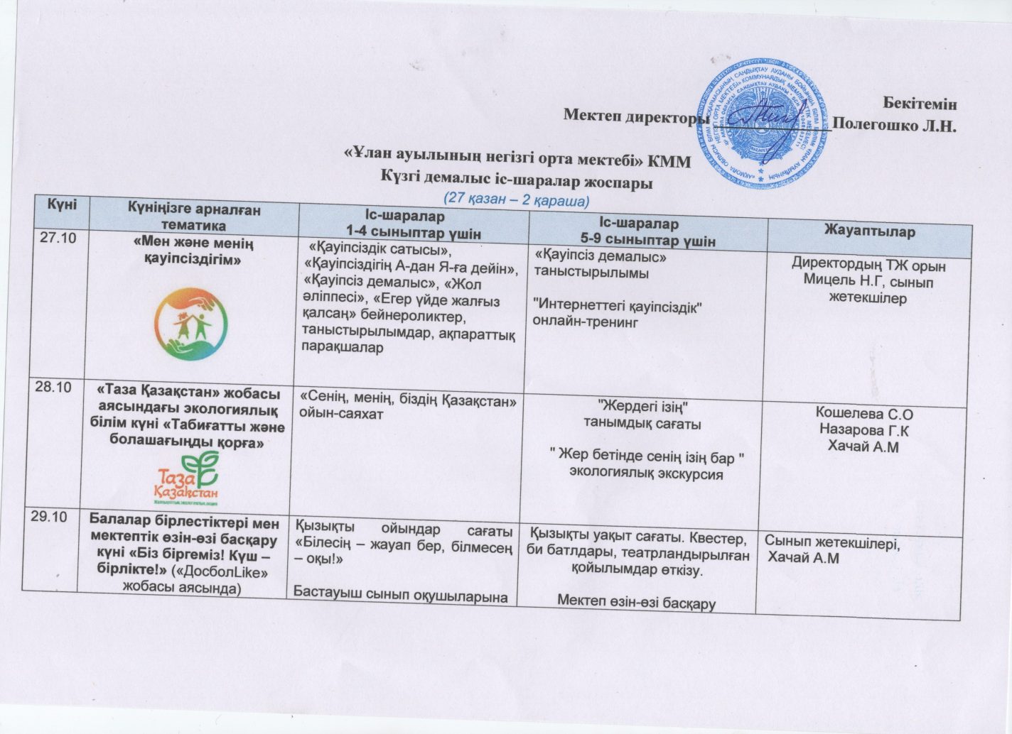 «Ұлан ауылының негізгі орта мектебі» КММ Күзгі демалыс іс-шаралар жоспары (27 қазан – 2 қараша)